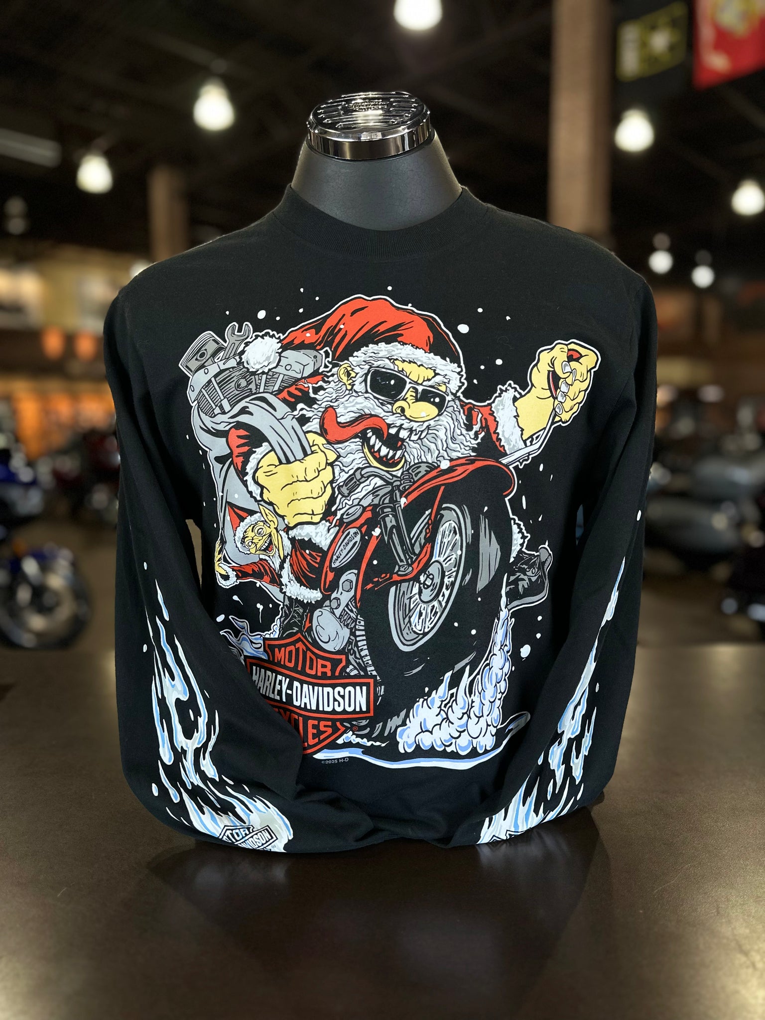 Meet the coolest guy on the Nice List—Santa's traded his reindeer for chrome and his sleigh for pure throttle! Made from durable 100% cotton that maintains shape for seasons to come. Front features a bold graphic of Santa and his helper on a Harley ripping a wheelie to deliver presents along with snow accents down both arms while the back is printed with our custom Maverick H-D logo that includes dealer name and location.